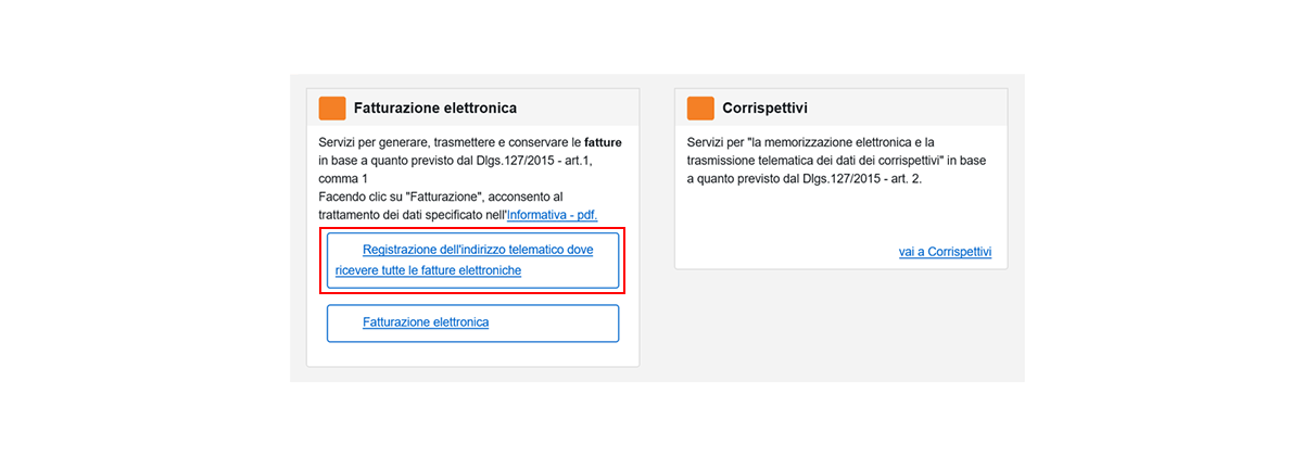 3.All’interno della propria area riservata, procedere con la “Registrazione dell’indirizzo telematico dove ricevere tutte le fatture elettroniche”.