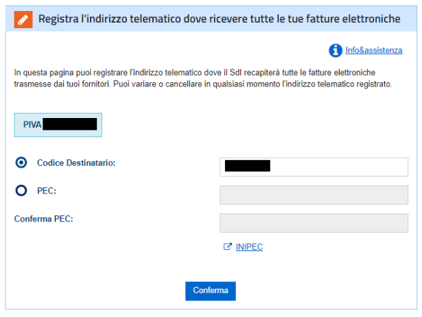 4.Inserire il codice destinatario fornito dal proprio intermediario e confermare.
